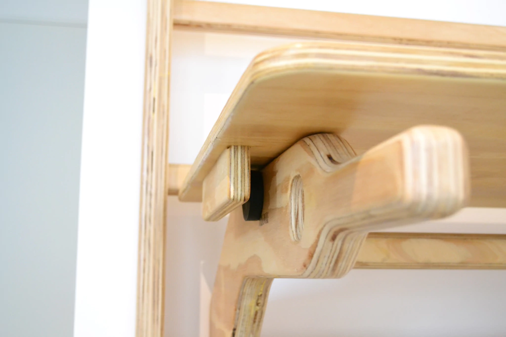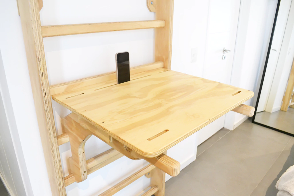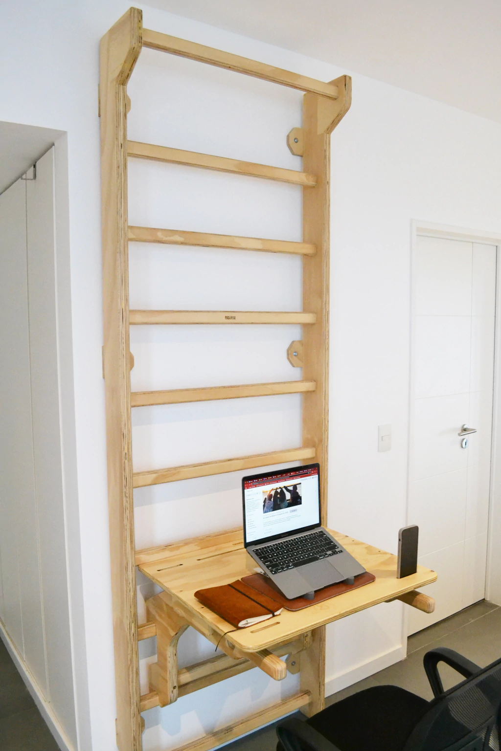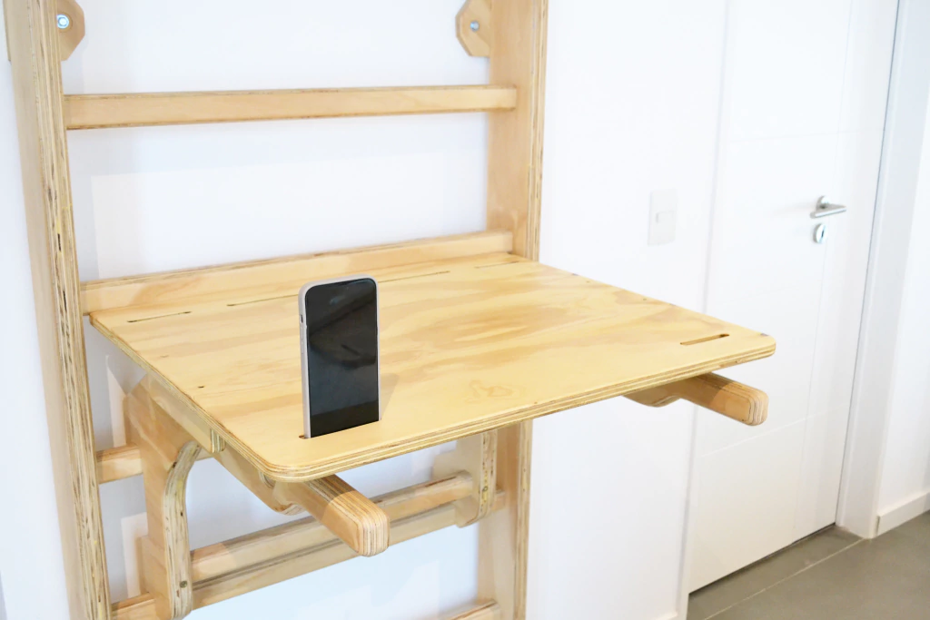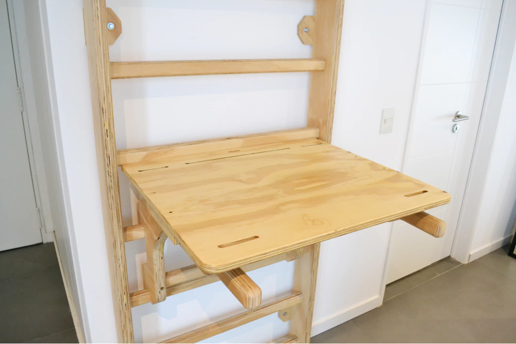Convierte tu Espaldar Sueco en un espacio multifunción: entrená, trabajá o estudiá en el mismo rincón. Esta mesa-escritorio se integra de forma práctica y estética, aprovechando la robustez y el diseño del espaldar.