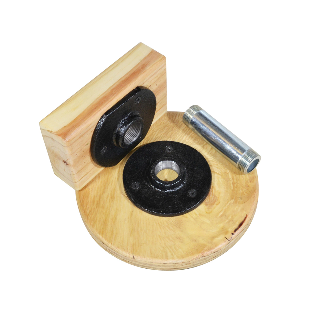 Bases individuales de madera firme con una fina capa de goma-eva por debajo para mayor firmeza en casi cualquier superficie, niples (tubos) de 3/4 con pared de 2mm galvanizados, bridas pintadas con convertidos negro, y tacos medianos modelo TEb0004. Todo cuidadosamente lijado y barnizado